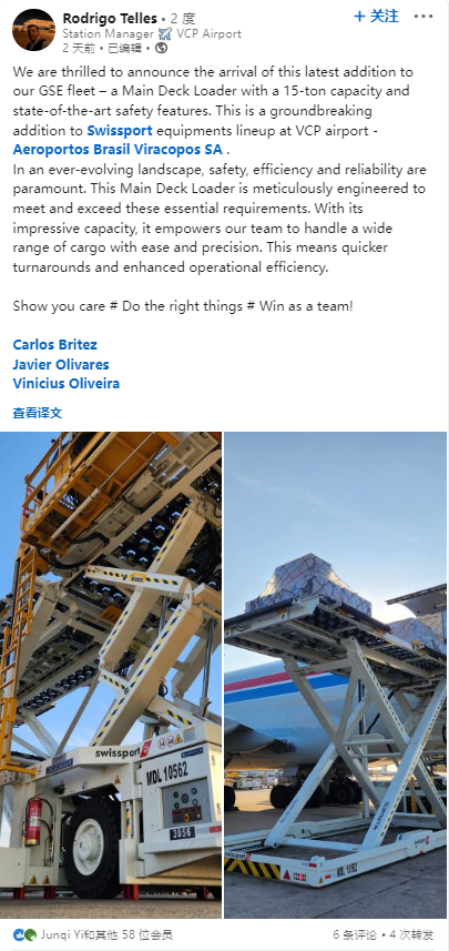 近期,由于威海廣泰集裝貨物裝載機在海外市場的出色作業表現,全球領先的地服公司Swissport的一位相關代表在領英發文為廣泰產品點贊!我們很高興地宣布我們GSE車隊的最新成員的到來——一臺承載重量為15噸、具有最先進安全功能的集裝貨物裝載機。這是Swissport在坎皮納斯國際機場的…