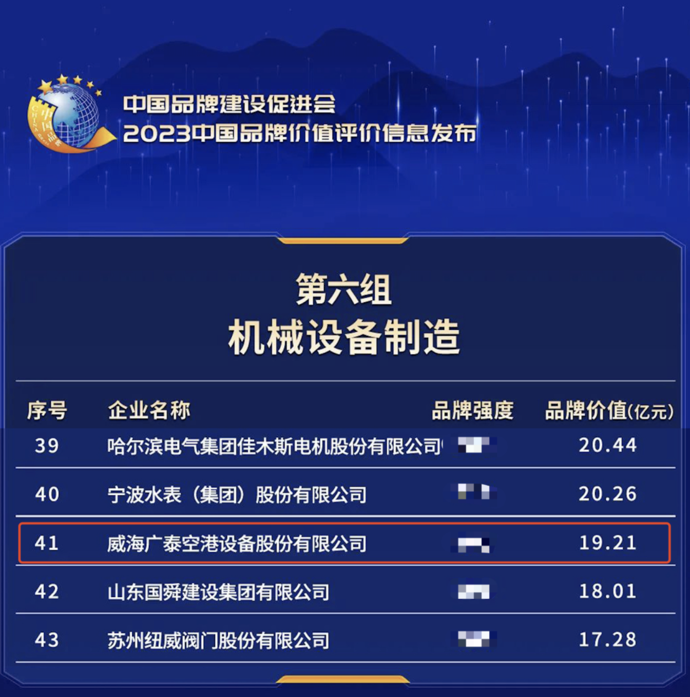 2023年5月11日,新華社、浙江省人民政府、中國(guó)品牌建設(shè)促進(jìn)會(huì)、中國(guó)資產(chǎn)評(píng)估協(xié)會(huì)等單位在浙江德清聯(lián)合發(fā)布“2023中國(guó)品牌價(jià)值評(píng)價(jià)信息”。威海廣泰空港設(shè)備股份有限公司(簡(jiǎn)稱“威海廣泰”)在此次發(fā)布評(píng)價(jià)機(jī)械設(shè)備制造組中,品牌價(jià)值獲評(píng)為19.21億元。“中國(guó)品牌價(jià)值評(píng)價(jià)信息發(fā)布”…